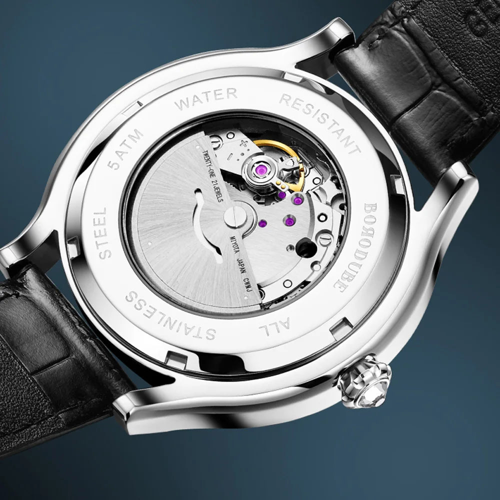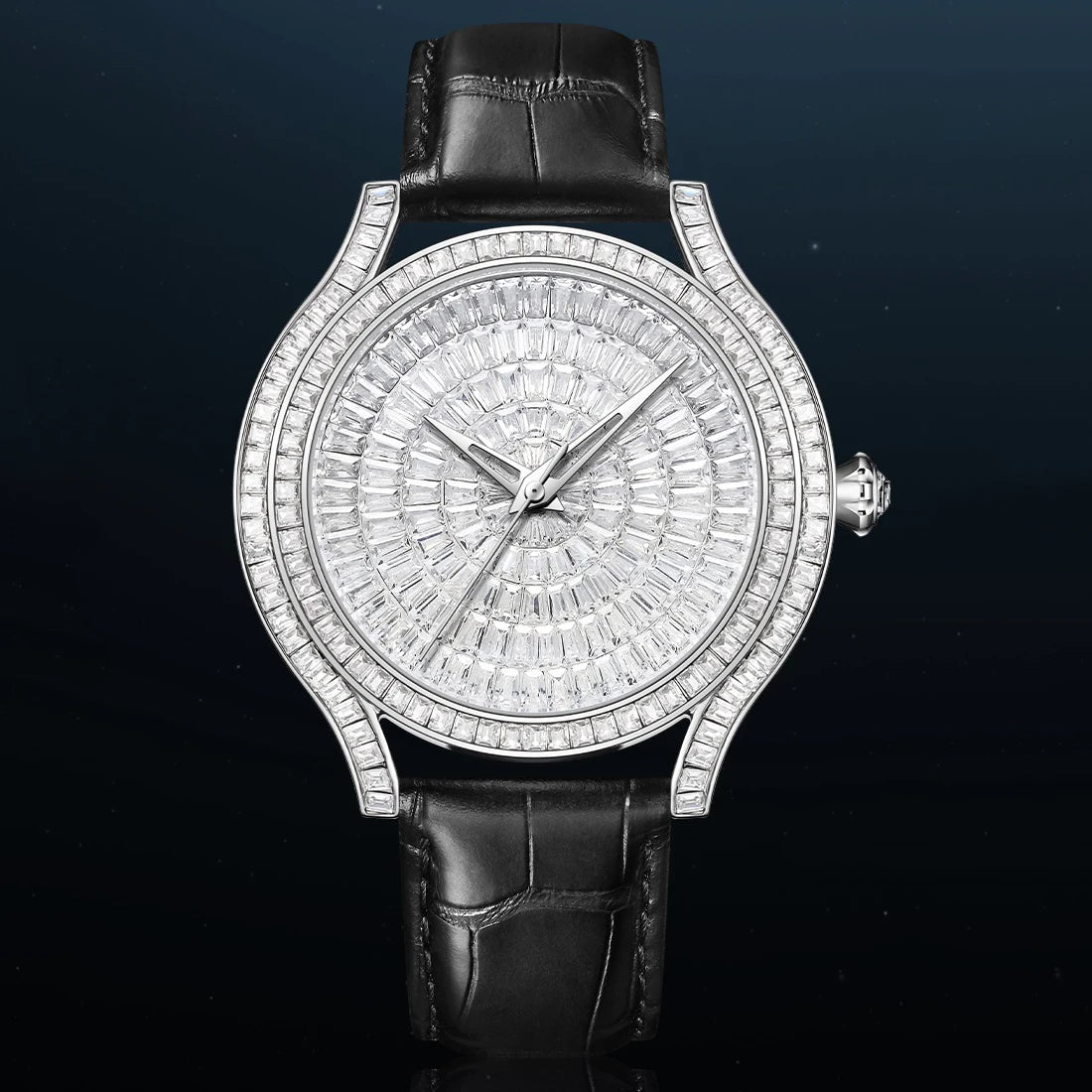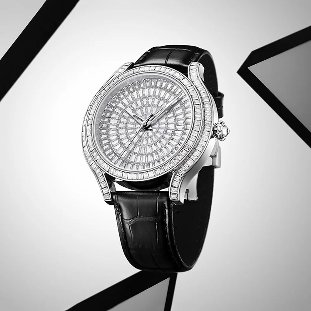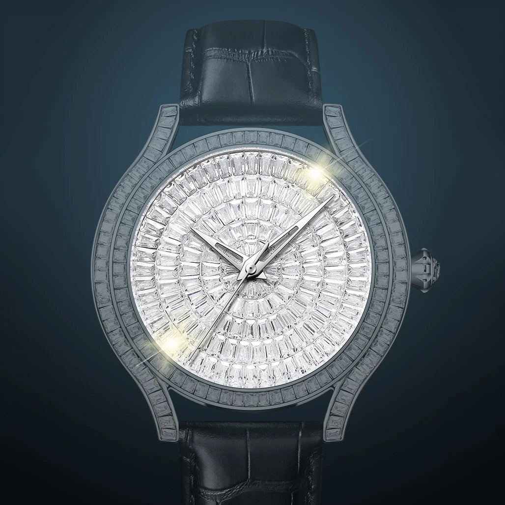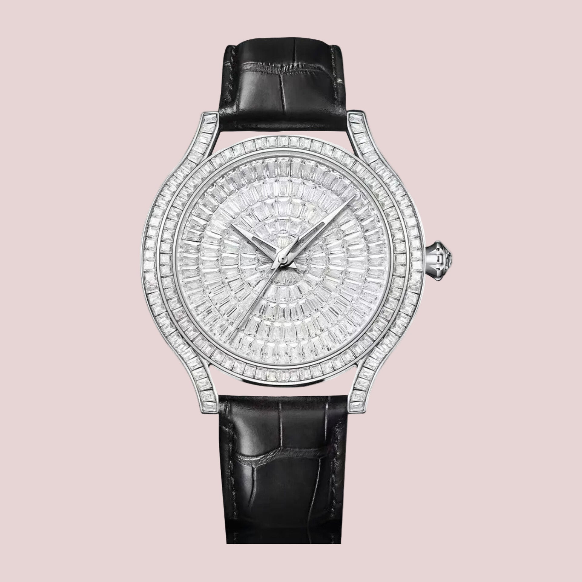 وجه لامع بتفاصيل ألماسية دقيقة، وهيكل ستانلس ستيل متين، مع حزام جلد فاخر يعطيك حضور قوي وراقي في كل مناسبة