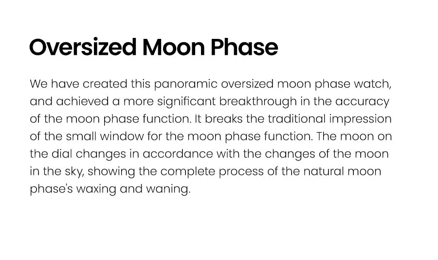ساعة فاخرة بتصميم عصري وساعة تعرض مراحل القمر بدقة، مع حركة أوتوماتيكية ذات كفاءة عالية واحتياطي طاقة يصل إلى 80 ساعة. مصنوعة من ستانلس ستيل مع زجاج كريستال سافير مقاوم للخدوش، وسوار جلد فاخر بنقشة التمساح ليمنحك إطلالة راقية