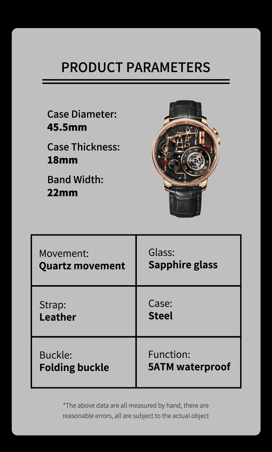 بتصميم جريء وهيكل فاخر من الفولاذ المقاوم للصدأ 316، تمنحك مظهراً احترافياً يناسب الاجتماعات الرسمية والمناسبات الراقية وحتى الاستخدام اليومي